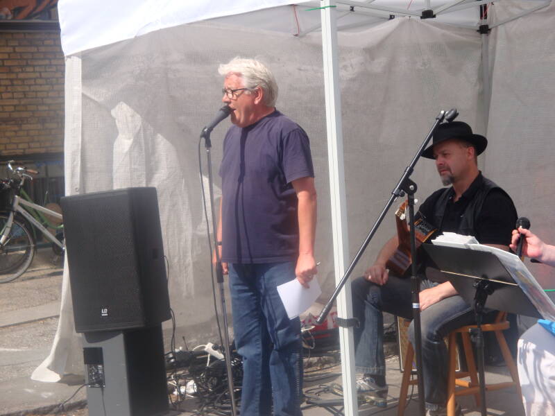 UK: Here the audience watches listen to Ballads and Blues. You can see Lars and Bettina in the background playing and singing. The weather is good, it's summer and the mood is high. The music festival is very local and is called "Rock in the Gutter Stone". It is led by local sponsors and store owners in Vanløse. The music festival was held right outside my and Lars' second home at Bogholder Alle 66 st th in Vanløse. So of course they were with.
